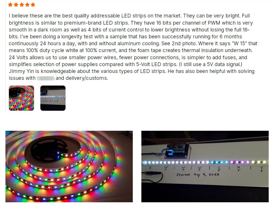 We’re delighted to share a positive customer feedback case. The client purchased a sample of our 24V Individually Addressable LED Strip and conducted a strict six-month testing process before finally deciding to place an order. Below is the client’s evaluation of the sample quality and their overall satisfaction with the final purchase.