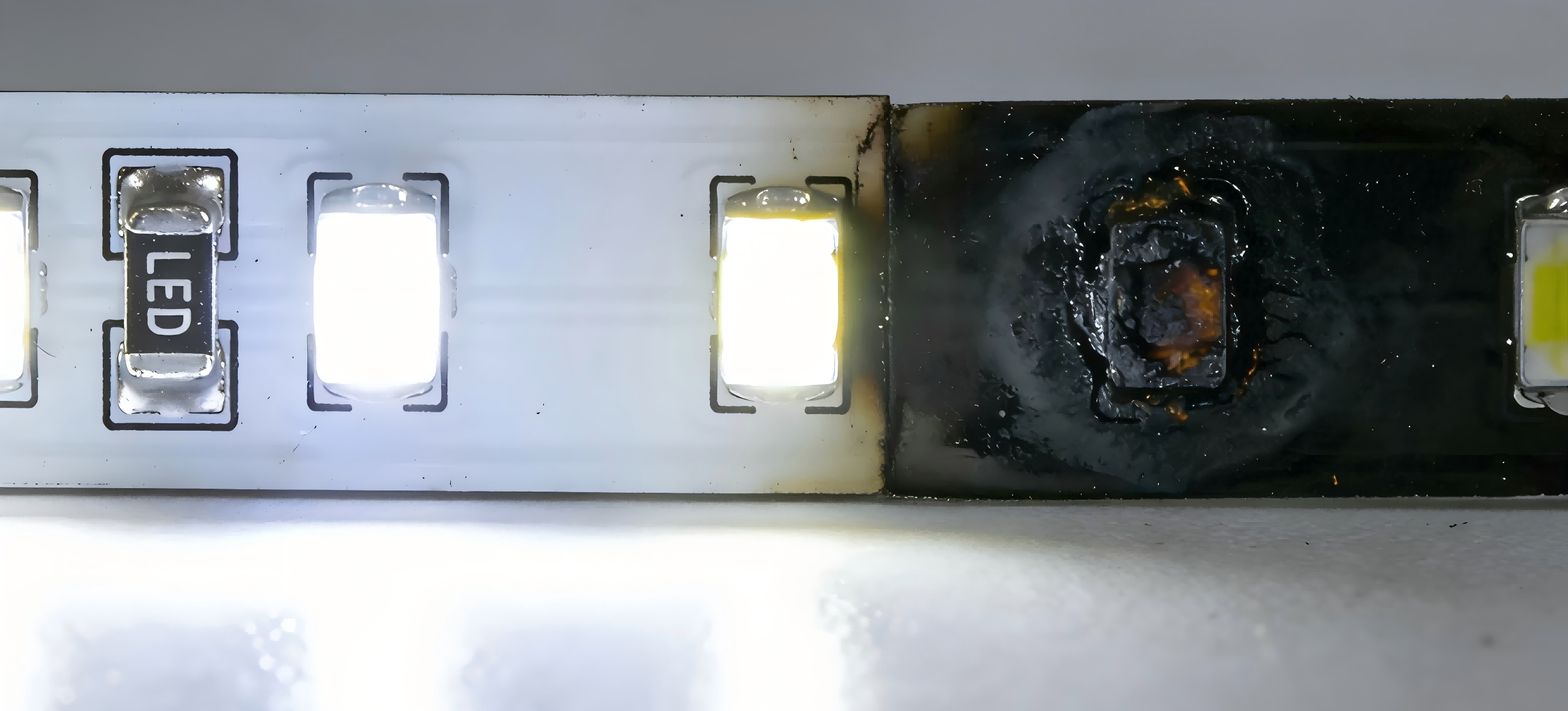 Each segment receives the same voltage in parallel, so a local failure does not affect the rest of the strip.