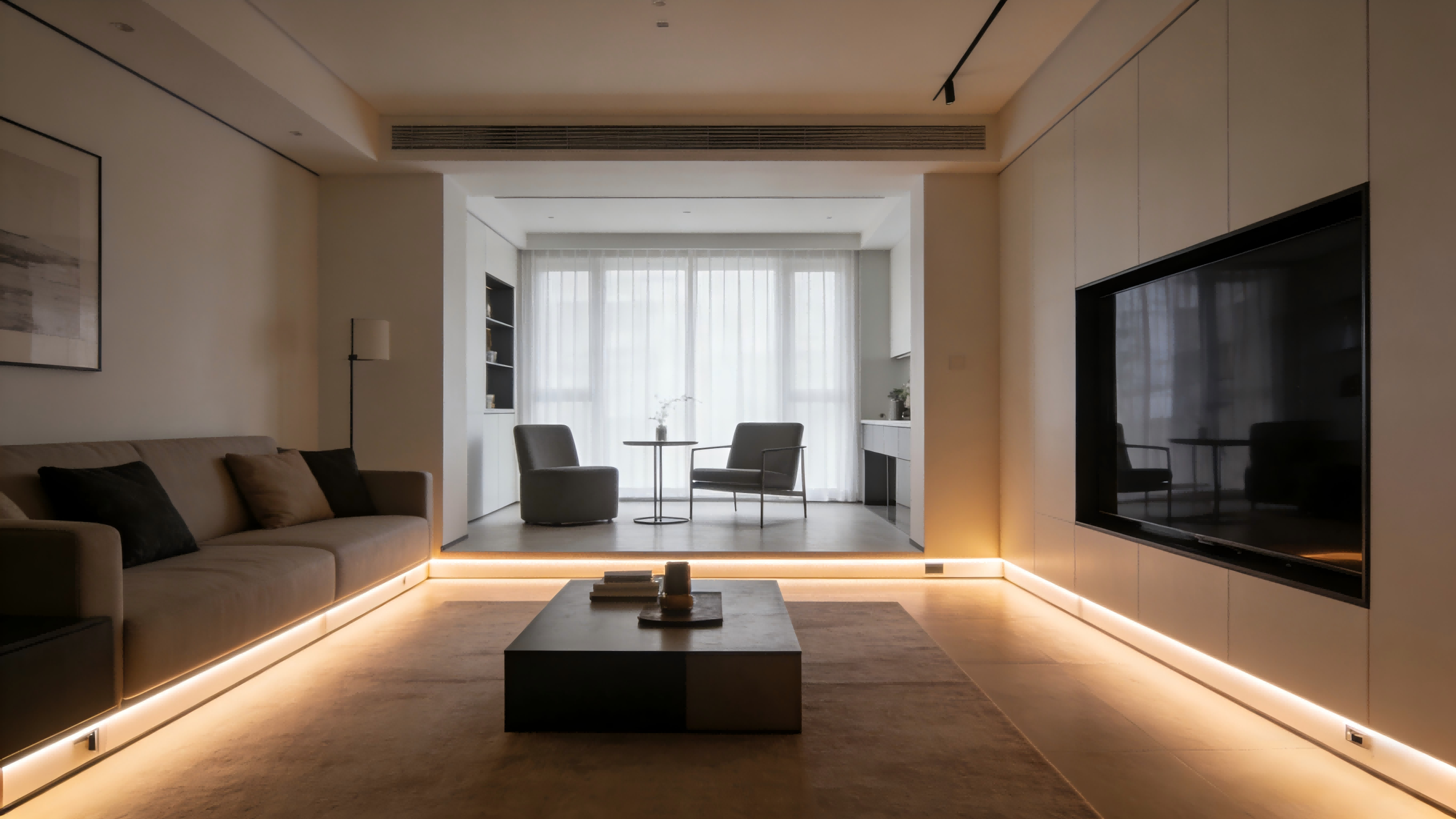 Incorporating LED duct-style baseboard lighting around the living room enhances the sleek lines of modern furniture, giving the space a cleaner and more layered look. The light softly spreads across the floor, creating a subtle depth to the room without being harsh. This effect helps create a relaxed atmosphere, perfect for daily relaxation and nighttime movie watching.